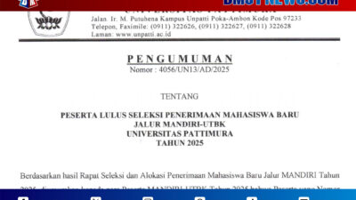 Ambon, – Universitas Pattimura (Unpatti) resmi mengumumkan hasil seleksi penerimaan mahasiswa baru jalur Mandiri-UTBK tahap…
